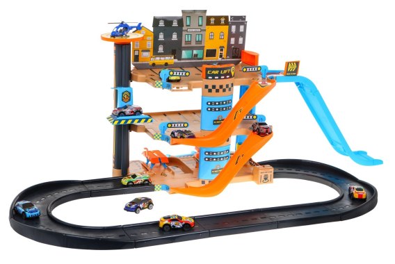 Duży, solidnie wykonany parking samochodowy z dziesięcioma aluminiowymi pojazdami i helikopterem w zestawie, to propozycja dla dzieci od trzeciego roku życia. Parking składa się z 4 poziomów. Na górnym poziomie znajduje się lotnisko dla helikoptera. Niżej mamy miejsca postojowe i zjazd dla samochodzików zjeżdżalnią na sam dół. Na drugim piętrze umiejscowiono miejsca parkingowe i zjazd na najniższy poziom. Na dole znajduje się myjnia, stacja benzynowa oraz ruchoma platforma konserwacyjna . Na każdy z poziomów możemy się dostać za pomocą windy- podnośnika. Winda nie wymaga użycia baterii, sterujemy nią ręcznie. Funkcje parkingu: - winda - podnośnik jeżdżący góra, dół, - ruchoma platforma konserwacyjna samochodu, -myjnia samochodowa, - stacja benzynowa, - zjeżdżalnie dla autek, - miejsca postojowe
