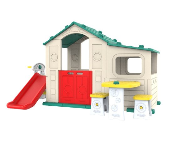 Domek ogrodowy ze zjeżdżalnią, koszykówką oraz ze stolikiem