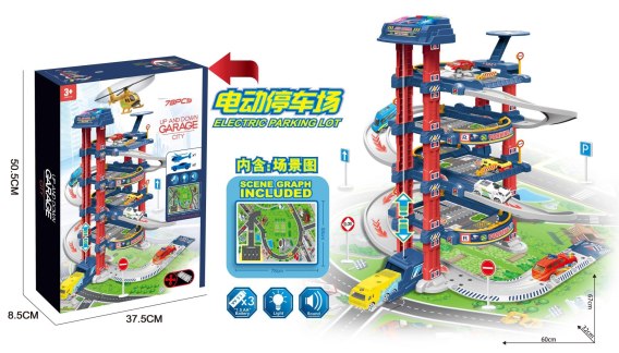 Duży interaktywny parking z elektryczną windą, torem dla autek i matą z drogami to propozycja dla dzieci od 3-go roku życia. Parking posiada wiele poziomów, na które można dostać się za pomocą elektrycznej windy. Każdy z poziomów połączony jest z innym zjeżdżalnią dla resoraków. Na górze garażu znajduje się panel z kolorowymi przyciskami, obsługujący windę. Czerwony guziczek opuszcza windę w dół, a żółty wyciąga ją w górę. Po wciśnięciu niebieskiego przycisku usłyszymy odgłosy charakterystyczne dla policji, straży pożarnej, karetki, a także strzelanie i odpalanie samochodu. Zielony przycisk po naciśnięciu wydaje odgłosy klaksonu. Na panelu sterowania windą migają się również niebieskie i czerwone światełka.