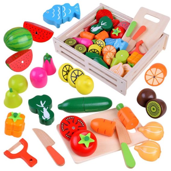 Drewniane warzywa i owoce do krojenia w naturalnej skrzynce - kreatywna zabawa dla małych kucharzy!