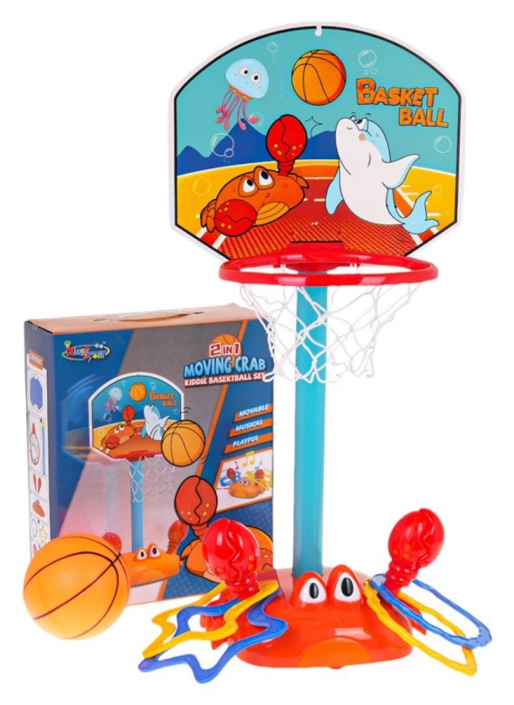 Gra zręcznościowa 2w1 koszykówka i ringo dla dzieci powyżej 3-go roku życia. Gra wykonana została z najlepszej jakości materiałów w żywych kolorach, przyciągających wzrok dziecka. Uciekający krab zaprasza do zabawy. Podstawą gry jest krab ze szczypcami, na które rzuca się obręcze, które znajdują się w zestawie. Nad krabem znajduje się kosz do gry w koszykówkę. Aby utrudnić zadanie, wesoły krab nie stoi w miejscu, ale ucieka w prawo i w lewo. Dziecko musi wykazać się sprytem, szybkością i celnością. Zabawka zasilana jest bateriami typu 3 x AA 1,5 V (brak w zestawie).