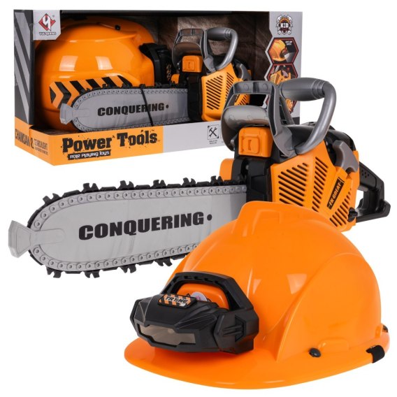 Interaktywny zestaw piła mechaniczna z efektami dźwiękowymi i kaskiem z latarką to propozycja dla dzieci od 3-go roku życia. Piła jest w pełni bezpieczna dla dzieci. Została wykonana z najlepszej jakości tworzywa sztucznego i nie posiada ostrych krawędzi. Łańcuch został wykonany z gumy. Aby uruchomić piłę, należy pociągnąć linkę rozruchową, usłyszymy wówczas odgłos odpalania silnika. By włączyć łańcuch, należy wcisnąć i przytrzymać dolny guzik na rączce. Łańcuch zacznie się obracać i wydawać odgłosy cięcia. Do zestawu dołączono kask z regulowaną lampką oraz gumką na brodę. Piła zasilana jest bateriami tupu 3 x AAA 1,5 V, baterii brak w zestawie. Kask zasilany jest bateriami typu 3 X AG13, baterie w zestawie.