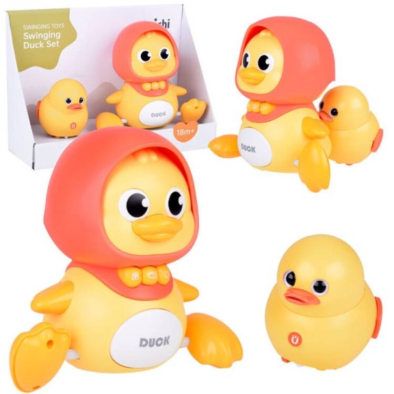 Urocze, grające kaczuszki to idealna zabawka dla maluchów, świetnie sprawdzi się podczas raczkowania dziecka. Maluszek będzie mógł spokojnie raczkować za kaczuszkami. Duża kaczka wydaje wesołe melodyjki, które z pewnością zachęcą do zabawy. Dodatkowo, kaczuszka porusza się po płaskiej powierzchni, bujając się rytmicznie na boki w takt muzyki.Zabawie towarzyszy światełko na brzuszku, które można wyłączyć poprzez naciśnięcie. Kaczuszkę włącza się za pomocą przycisku umieszczonego z tyłu. Zabawka oferuje możliwość jazdy z muzyką lub samodzielne odtwarzanie melodii. Przednie przyciski umożliwiają regulację głośności, a przycisk "księżyc" uruchamia wyciszoną melodię, idealną do usypiania dziecka. Dzięki wbudowanemu magnesowi kaczuszki można połączyć, tworząc uroczy "pociąg".