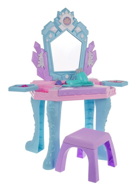Interaktywna toaletka z funkcją dźwięku i światła to propozycja dla dzieci od 3-go roku życia. W zestawie znajduje się toaletka z taboretem oraz atrapy kosmetyków i biżuterii. Jest też działająca suszarka do włosów z lekkim nawiewem i odgłosami suszenia. Toaletka posiada duże lusterko, na którym po wciśnięciu przycisku znajdującego się na dole lustra wyświetlają się księżniczki przy akompaniamencie wesołych melodii. Na przodzie i bokach toaletki umiejscowiono schowki na kosmetyki i biżuterię. Toaletka zasilana jest bateriami typu 3 x AA 1,5V (brak w zestawie). Suszarka zasilana jest baterią typu 1 x AA (brak w zestawie).