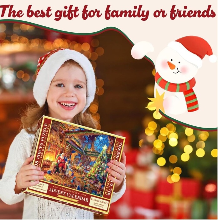 Wyjątkowy kalendarz adwentowy z 24 pudełkami pełnymi puzzli – łącznie 1008 elementów tworzących świąteczny obraz w rozmiarze 70 x 50 cm 🎅🏻. Wielkie odliczanie do Bożego Narodzenia. Uzupełniaj puzzle każdego dnia aż do Wigilii 🎄. Wysoka jakość i idealny pomysł na prezent dla całej rodziny 🎁.