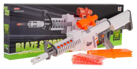 Półautomatyczny karabin na pociski dla dzieci od 8-go roku życia. Pistolet wyposażono w duży wysuwany magazynek, mieszczący 10 pocisków i celownik. Użycie karabinu jest bardzo proste, wystarczy namierzyć cel, naładować i przycisnąć spust. Pocisk poszybuje na odległość ok. 15 metrów. Karabin zasilany jest bateriami typu 5 x AA 1,5 V(brak w zestawie).