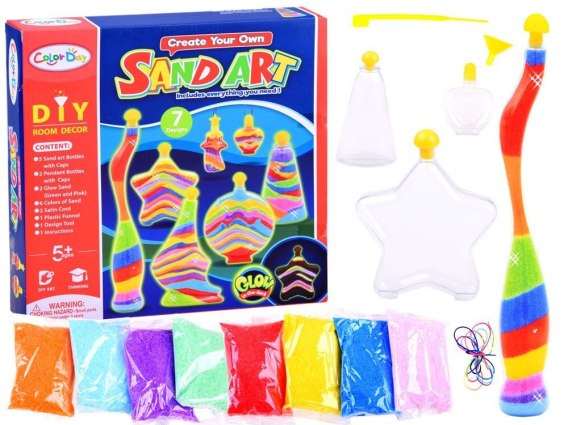 Kreatywny zestaw do samodzielnego zrobienia obrazku z kolorowego piasku w butelce flakoniku. Zrób sam ozdobę.