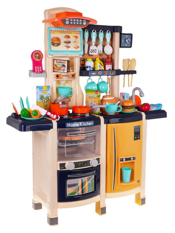 Interaktywna kuchnia z funkcją światła, dźwięku i kranikiem, z którego wydobywa się woda, a także mnóstwem akcesoriów, dla dzieci od 3-go roku życia. Kuchnia została znakomicie wykonana, z najlepszej jakości plastiku i jest w żywych kolorach zachęcających dziecko do zabawy. Na blacie kuchni znajduje się interaktywna płyta z palnikami. Po przekręceniu jednego z pokręteł słychać odgłosy gotowania, a drugiego, odgłosy smażenia. Odgłosom gotowania i smażenia towarzyszy podświetlenie palników. Z kranu faktycznie wypływa woda, jak w prawdziwym zlewie, dziecko będzie mogło umyć zabawkowe naczynia. W zestawie mamy też atrapę lodówki z otwieranymi drzwiczkami i dystrybutorem wody, otwierany piekarnik z efektami dźwiękowymi i świetlnymi, zmywarkę, ekspres do kawy, panel z wentylatorem oraz efektami dźwiękowymi i świetlnymi, telefonik z dźwiękiem i światłem oraz mnóstwo półeczek, na których ułożyć możemy atrapy produktów. Cały zestaw prezentuje się znakomicie. Zabawka zasilana jest bateriami typu 6 x AA 1,5 V (brak w zestawie) oraz 2 x AAA 1,5 V (brak w zestawie).