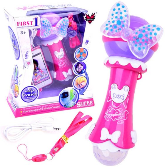 Mikrofon karaoke dla dzieci pozwoli spełnić marzenia dziecka o byciu prawdziwą gwiazdą. Teraz każda mała dziewczynka będzie mogła śpiewać jak ulubiona piosenkarka. Śpiewanie z mikrofonem karaoke to świetna zabawa i radość każdego dnia, a być może odkrycie swojego talentu:) Mikrofon posiada funkcję nagrywania, i odtwarzania, ma również wejście na MP3 co pozwoli na śpiewanie ulubionych piosenek do oryginalnego podkładu. Mikrofon daje jeszcze możliwość zmiany głosu dziecka na pięć różnych styli, co może uatrakcyjnić każdą zabawę. Dodatkową atrakcją są efekty świetlne, mrugająca kokardka i kula na dole mikrofonu. Dla dzieci, które uwielbiają muzykę, polecamy również produkt, taki jak gitara elektryczna zabawka