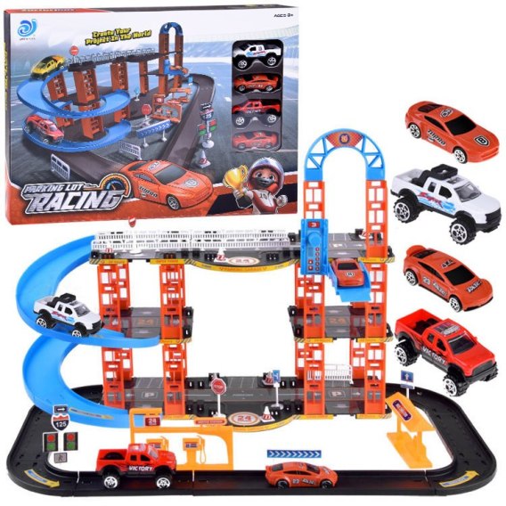 Wielopoziomowy parking samochodowy to super zabawa dla każdego chłopca. Spiralne zjazdy, ruchoma winda, znaki informacyjne, stacja benzynowa czy przystanek autobusowy są doskonałym uzupełnieniem zestawu. Parking posiada ruchomą windę, zjeżdżalnie, światła drogowe, znaki drogowe, dzięki, którym dzieci będą mogły wymyślać najróżniejsze opcje zabawy. Zestaw jest do samodzielnego złożenia. Zabawka świetnie sprawdzi się jako prezent dla każdego małego pasjonaty samochodów.