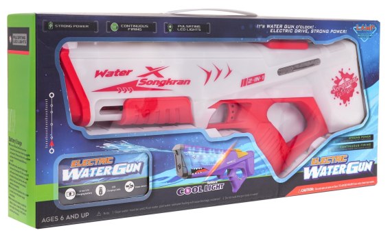 Elektryczny pistolet na wodę z podświetleniem dla dzieci od 6-go roku życia. Pistolet wykonano z najlepszej jakości materiałów, zasilany jest akumulatorem typu 3,7 V (w zestawie). Posiada podświetlenie, co umożliwia zabawę nawet późnym wieczorem. Zasada działania pistoletu jest bardzo prosta. Uzupełniamy zbiorniczek na wodę, znajdujący się w górnej części pistoletu. Następnie odbezpieczamy pistolet (przycisk koło spustu) i naciskamy spust. Pistolet może być również używany bez zasilania, manualnie.