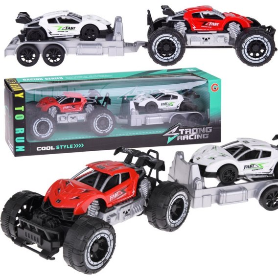 Auto Terenowe z lawetą i sportowym samochodem to pojazd dla którego żadna przeszkoda nie będzie straszna. Autka oraz laweta wykonane zostały w całości z plastiku. Koła lawety i sportowego auta są gumowe zaś autka terenowego plastikowe. Terenowe autko porusza się poprzez rozpędzenie w przód, a sportowe dzięki zastosowanemu mechanizmu pull-back - pociągnij w tył i puść. Przyczepa pełni funkcję lawety na której transportowane jest sportowe autko, idealny na wyjazdy rajdowe. Zestaw pojazdów to frajda dla małego kolekcjonera i fana motoryzacji. Różnorodność pomoże rozwinąć wyobraźnie oraz zdolności manualne u dziecka.