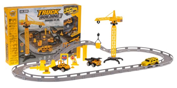 Bogato wyposażony zestaw tor z autkami budowlanymi i dźwigiem dla dzieci od 3-go roku życia. Zestaw składa się z 21 elementów do samodzielnego złożenia. Wykonany został z najlepszej jakości plastiku. Tory posiadają barierki zabezpieczające autka przed wypadaniem. Dźwig wyposażono w ruchome elementy takie jak obrotowe ramię o 360 stopni i opuszczany hak z załadunkiem (manualnie na korbkę). W zestawie znajdują się 3  autka budowlane takie jak: wywrotka, walec i autko elektryczne. Koparka i walec posiadają metalową karoserię oraz ruchome elementy. Walec posiada ruchomy i obrotowy bęben, a wywrotka podnoszoną i opuszczaną przyczepę. Autko elektryczne zasilane jest bateriami typu 1 x AA 1,5 V (brak w zestawie).