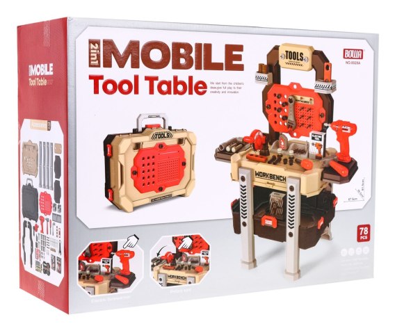 Bogato wyposażony warsztat z interaktywną wiertarką, pilarką i akcesoriami to propozycja dla dzieci od 3-go roku życia. Zestaw składa się z 78 elementów do złudzenia przypominających realne narzędzia. Wiertarko-wkrętarka wydaje odgłosy towarzyszące wkręcaniu i wykręcaniu oraz posiada dwie wymienne końcówki. Poszczególne narzędzia można dowolnie rozmieścić na praktycznym stojaku. Po skończonej zabawie, wszystkie elementy można zamknąć w dużej walizce na narzędzia z wygodną rączką do przenoszenia. Zabawka zasilana jest bateriami typu 2 x AA (brak w zestawie).