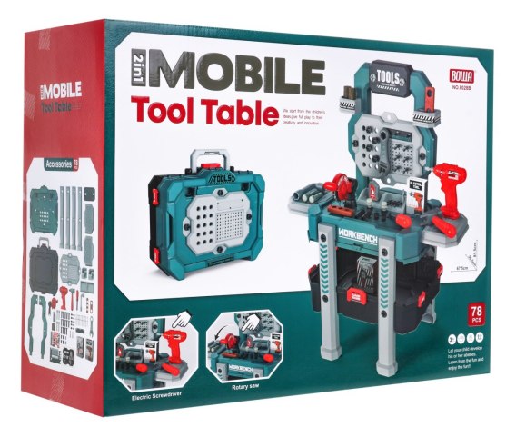 Bogato wyposażony warsztat z interaktywną wiertarką, pilarką i akcesoriami to propozycja dla dzieci od 3-go roku życia. Zestaw składa się z 78 elementów do złudzenia przypominających realne narzędzia. Wiertarko-wkrętarka wydaje odgłosy towarzyszące wkręcaniu i wykręcaniu oraz posiada dwie wymienne końcówki. Poszczególne narzędzia można dowolnie rozmieścić na praktycznym stojaku. Po skończonej zabawie, wszystkie elementy można zamknąć w dużej walizce na narzędzia z wygodną rączką do przenoszenia. Zabawka zasilana jest bateriami typu 2 x AA (brak w zestawie).