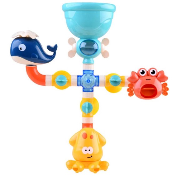 Jak się bawić? Wodę wlewamy od góry do zabawki, wówczas wędruje ona w środku a następnie wylatuje otworami tworząc fontannę lub wodospad. Dzięki zamontowanym lejkom, wlewanie wody jest łatwe i przyjemne. Fontanna wykonana z bezpiecznych materiałów, kolorowa zabawka uatrakcyjni codzienną kąpiel i zachęci do zabawy każdego malucha. Kształty morskich zwierząt ośmiornicy, wieloryba i kraba nadają zabawce morskiego klimatu. Dzieci uwielbiają montować, rozbierać i tworzyć różne kombinacje. Ta zabawka do kąpieli jest łatwa w montażu i demontażu i pozwala stworzyć wiele różnych kombinacji do zabawy. Można zamieniać rozmieszczenie zwierzątek, odłączać poszczególne rurki lub za pomocą żółtych pokrętełek zamykać lub otwierać dopływ wody.