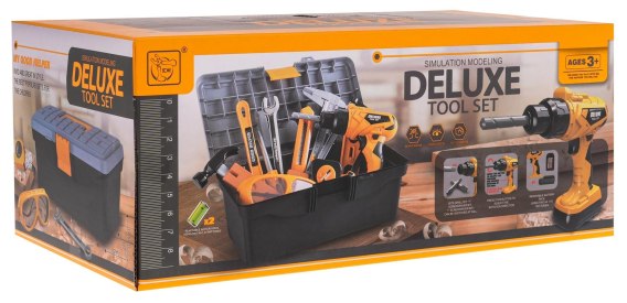 Bogato wyposażony zestaw narzędzi z interaktywną wiertarko-wkrętarką oraz skrzynką narzędziową dla dzieci powyżej 3-go roku życia. Zestaw wykonany został z najlepszej jakości plastiku i posiada aż 37 elementów. Prócz dużej skrzynki na narzędzia, wyglądającej profesjonalnie w zestawie mamy też: interaktywną wiertarko-wkrętarkę z wymiennymi bitami, okulary ochronne, maseczkę, śrubokręt, młotek, klucz francuski, kombinerki, obcęgi, oraz wiele śrubek, nakładek, drewienek do wkręcania. Wiertarko-wkrętarka zasilana jest bateriami typu 2 x AA 1,5 V (brak w zestawie). Wkręca i wykręca, posiada wymienne bity, oraz wyjmowany akumulator.