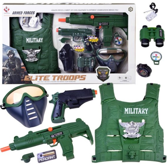 Ten bogato wyposażony zestaw świetnie sprawdzi się na balu karnawałowym, przedstawieniu lub balu przebierańców itp. Pozwoli przeżyć Twojemu Dziecku wspaniałe chwile radości. Zestaw jest świetnie dopracowany z zadbaniem o najdrobniejsze szczegóły wojskowe.