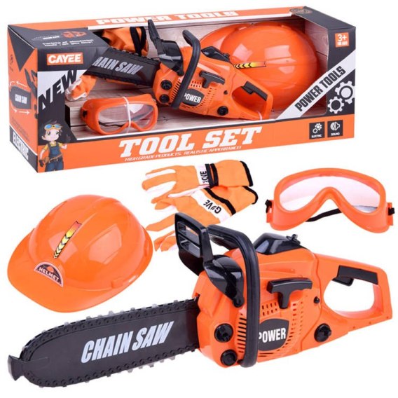 Zestaw małego drwala z piłą i akcesoriami ochronnymi. Piła, kask, okulary, rękawice.